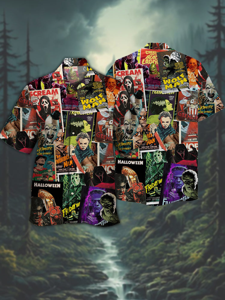 • Eye-Catching Thriller Horror Movie Character Poster Patchwork Printing Cuban Collar Hawaiian Short Sleeve Shirt