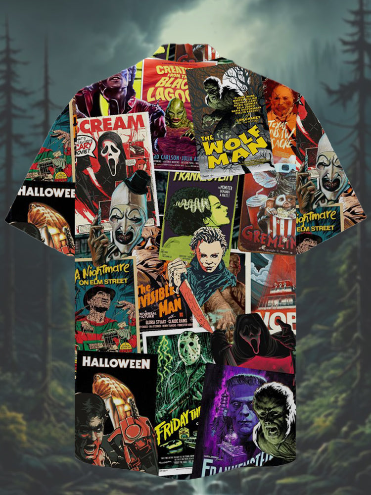 Eye-Catching Thriller Horror Movie Character Poster Patchwork Printing Cuban Collar Hawaiian Short Sleeve Shirt