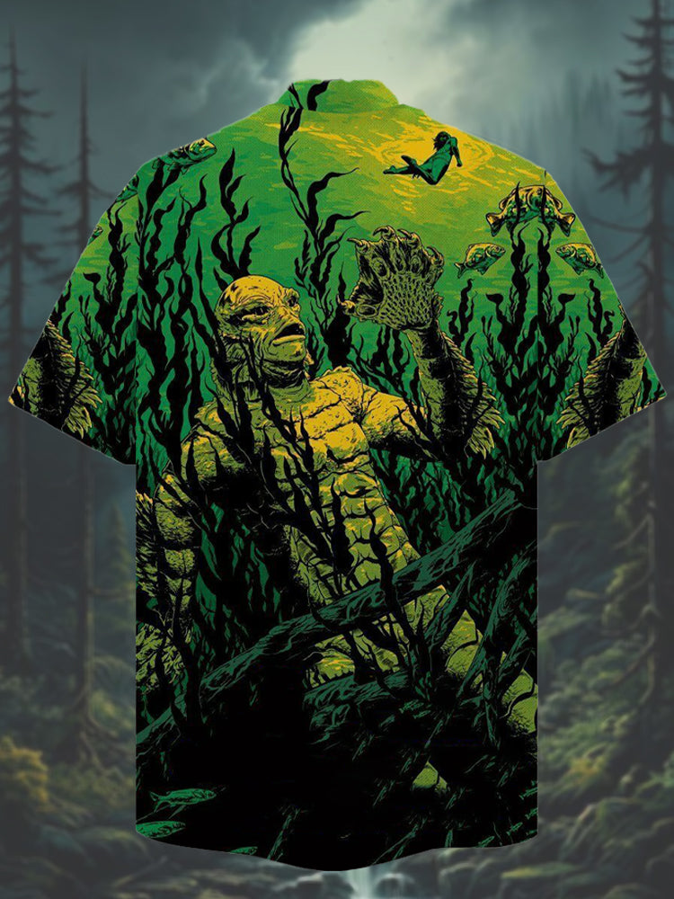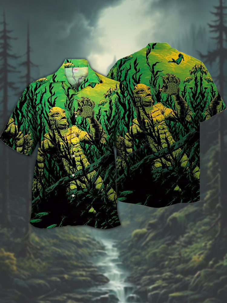 • Eye-Catching Green Terror Monster And Seaweed Printing Cuban Collar Hawaiian Short Sleeve Shirt