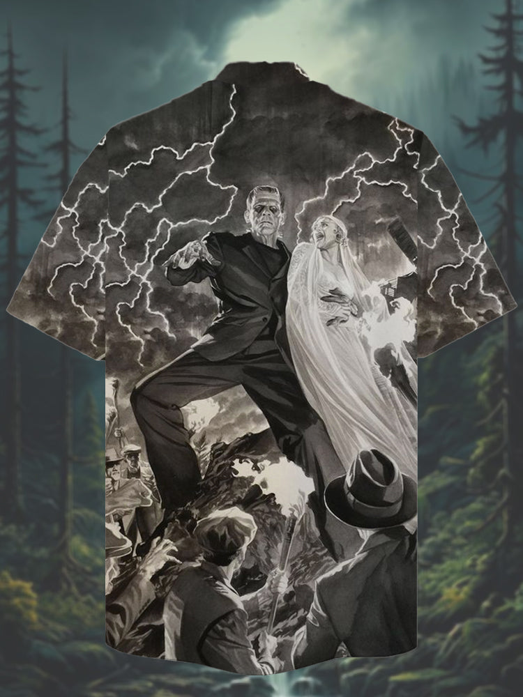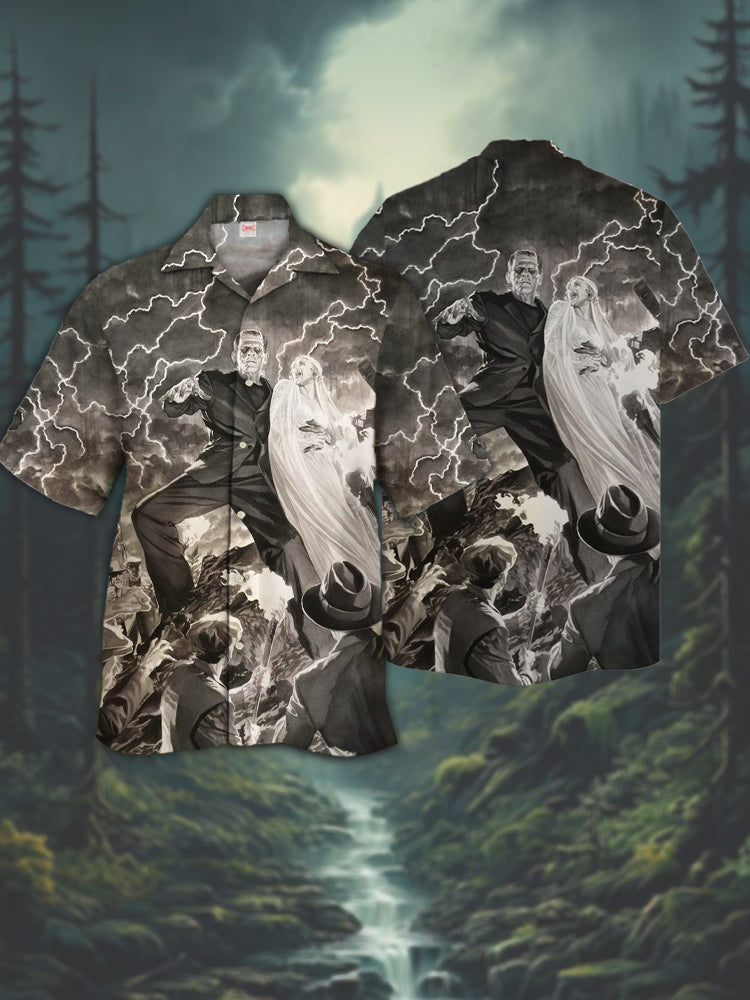 • Eye-Catching Stunning Style Horror Characters Under Lightning Printing Cuban Collar Hawaiian Short Sleeve Shirt