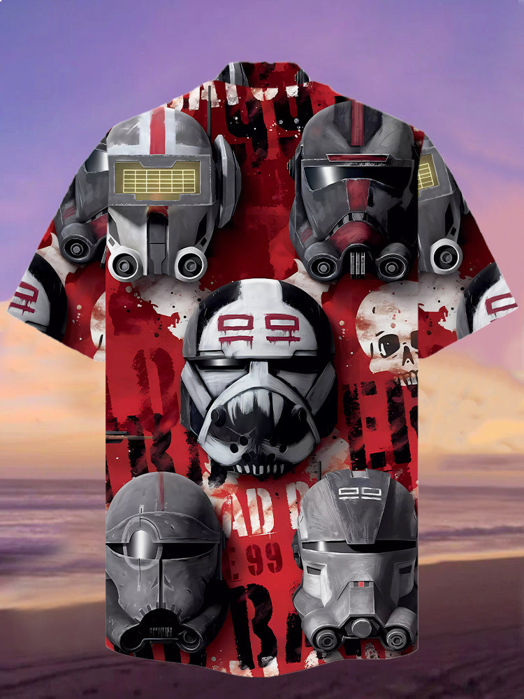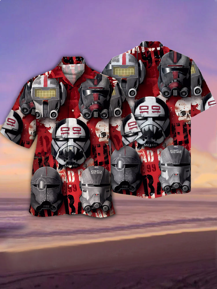 Eye-Catching Red Posters And Space Samurai Helmets Printing Cuban Collar Hawaiian Short Sleeve Shirt
