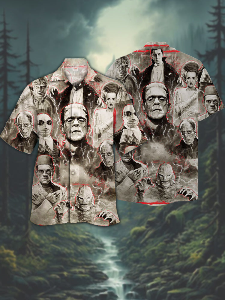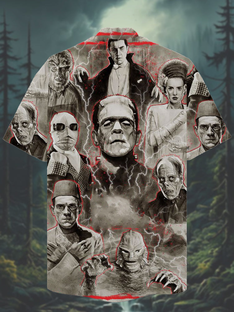 Eye-Catching Black And White Horror Movie Characters Group Portrait And Lightning Printing Cuban Collar Hawaiian Short Sleeve Shirt