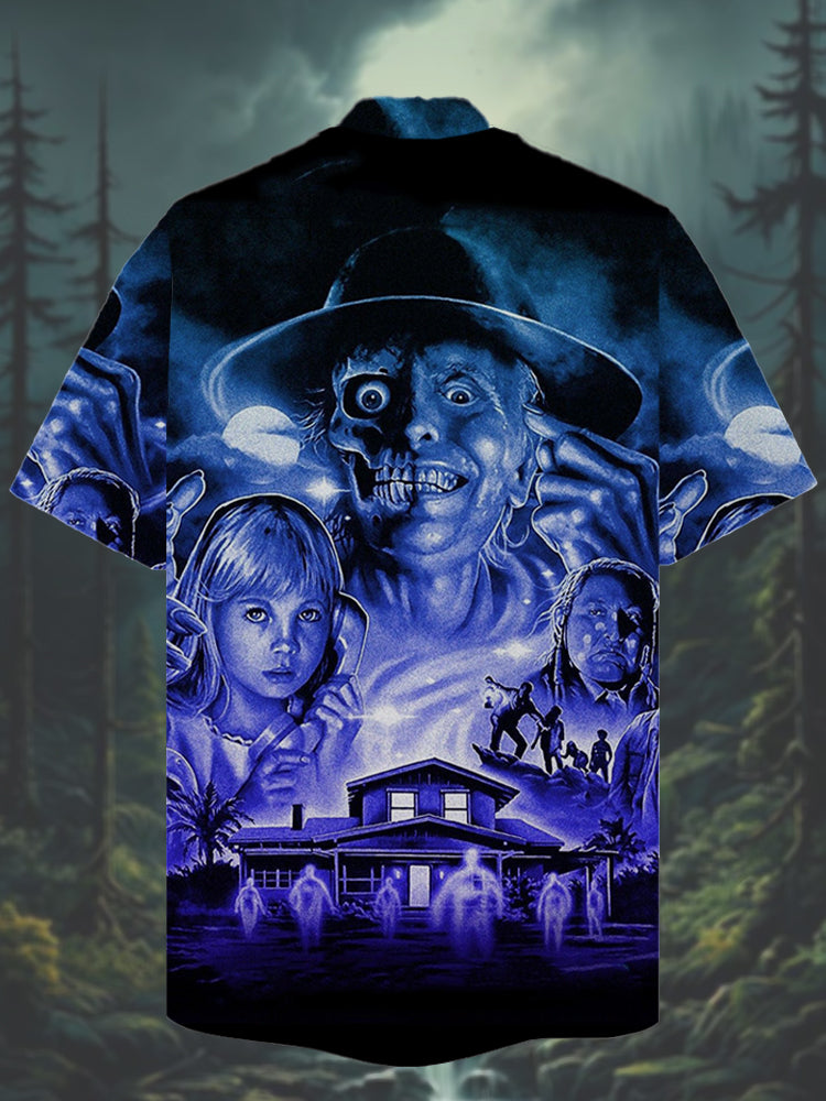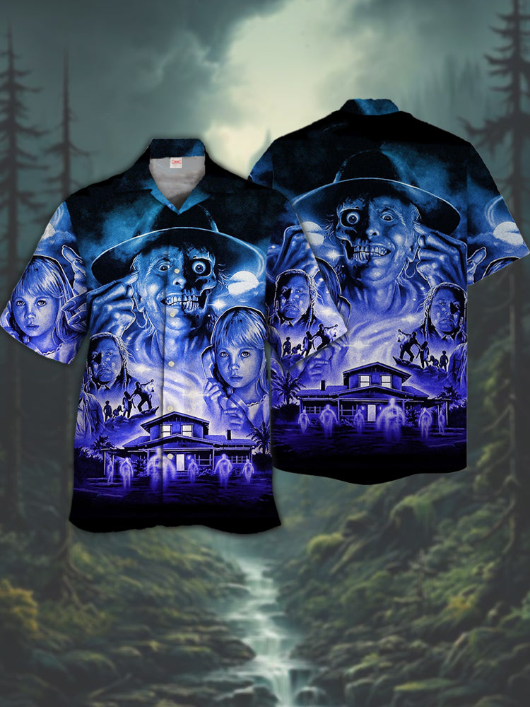 • Eye-Catching Psychedelic Blue Purple Comic Art Classic Horror Characters Printing Cuban Collar Hawaiian Short Sleeve Shirt
