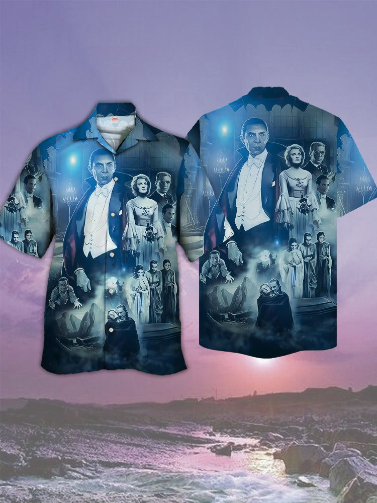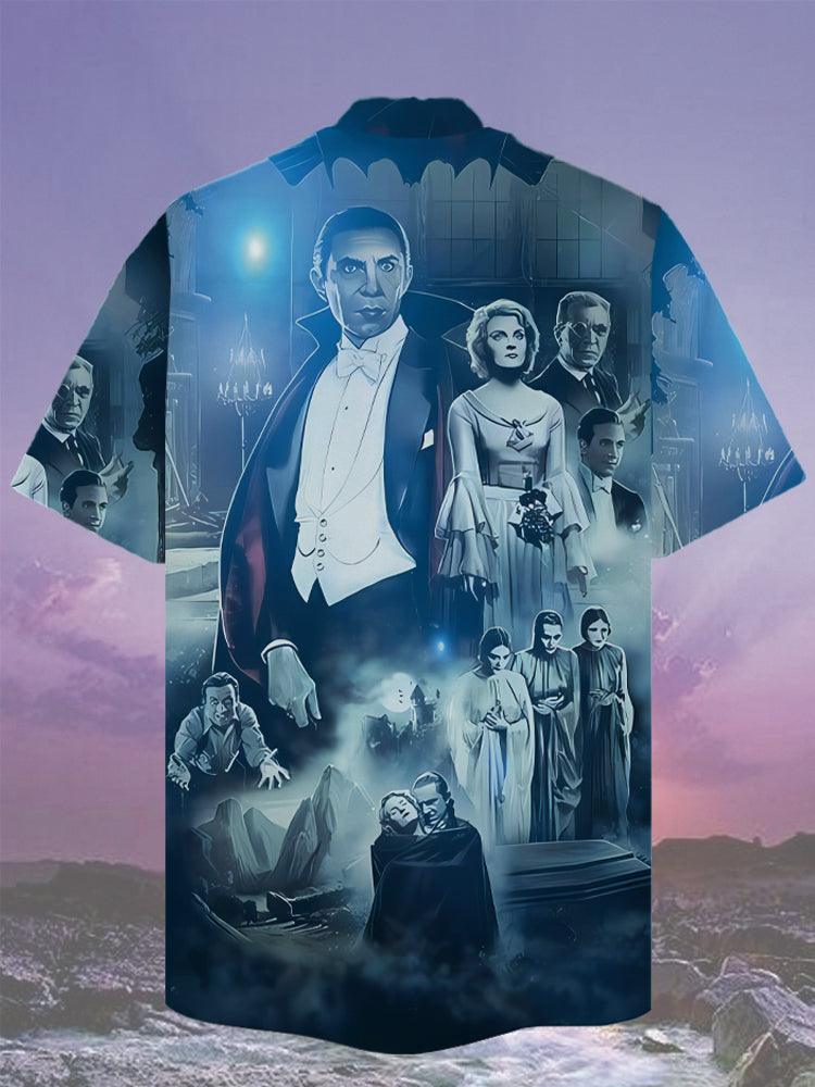 • Eye-Catching Psychedelic Blue Comic Art Classic Horror Characters Printing Cuban Collar Hawaiian Short Sleeve Shirt