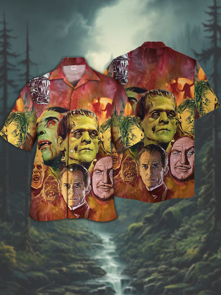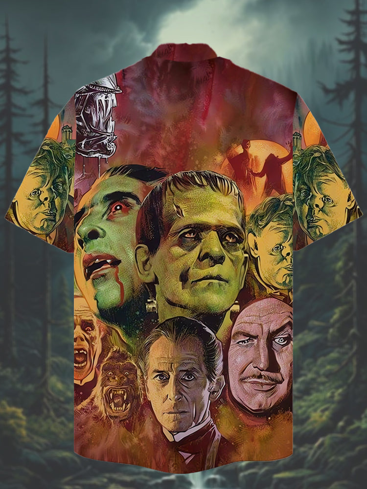 • Eye-Catching Red Comic Art Classic Horror Characters Printing Cuban Collar Hawaiian Short Sleeve Shirt