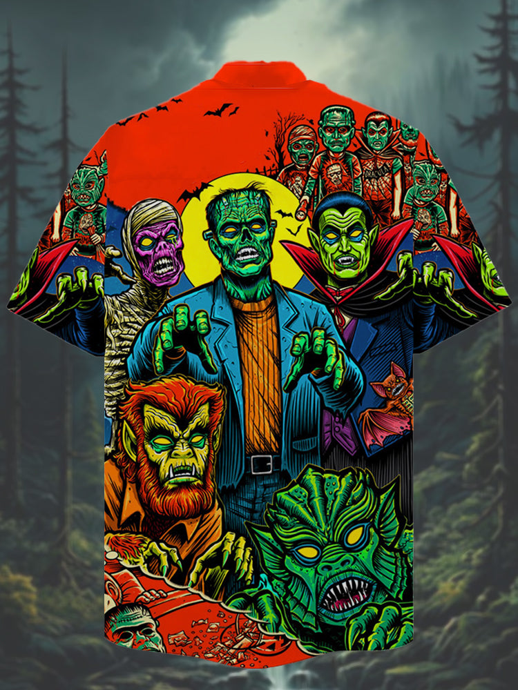 Eye-Catching Colorful Comic Art Classic Horror Characters Printing Cuban Collar Hawaiian Short Sleeve Shirt