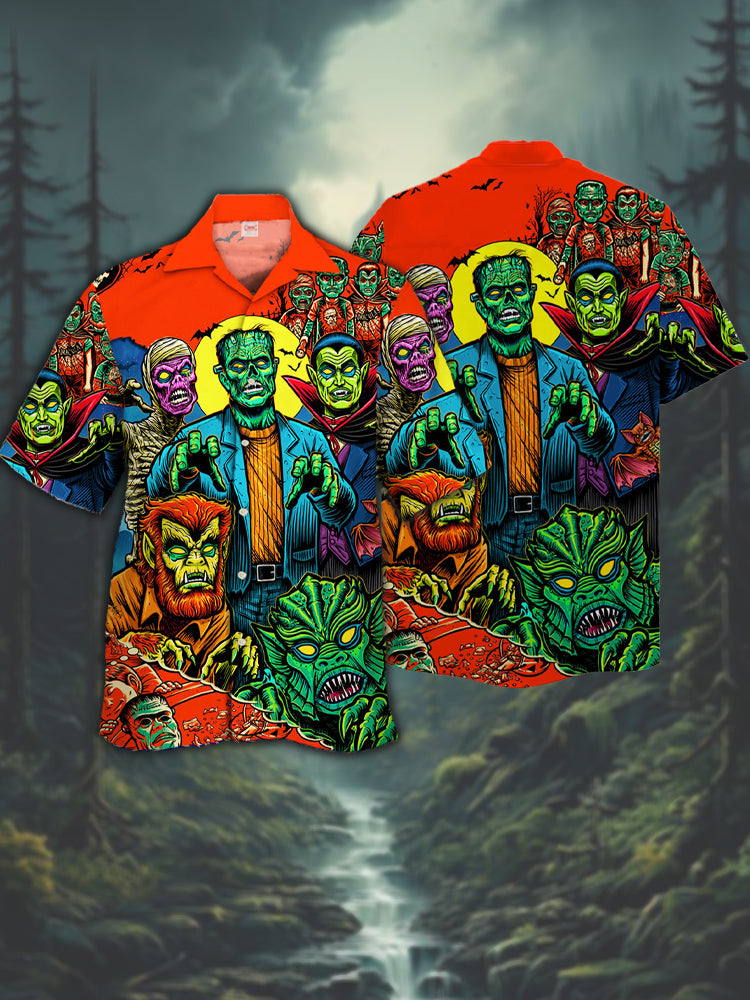 • Eye-Catching Colorful Comic Art Classic Horror Characters Printing Cuban Collar Hawaiian Short Sleeve Shirt