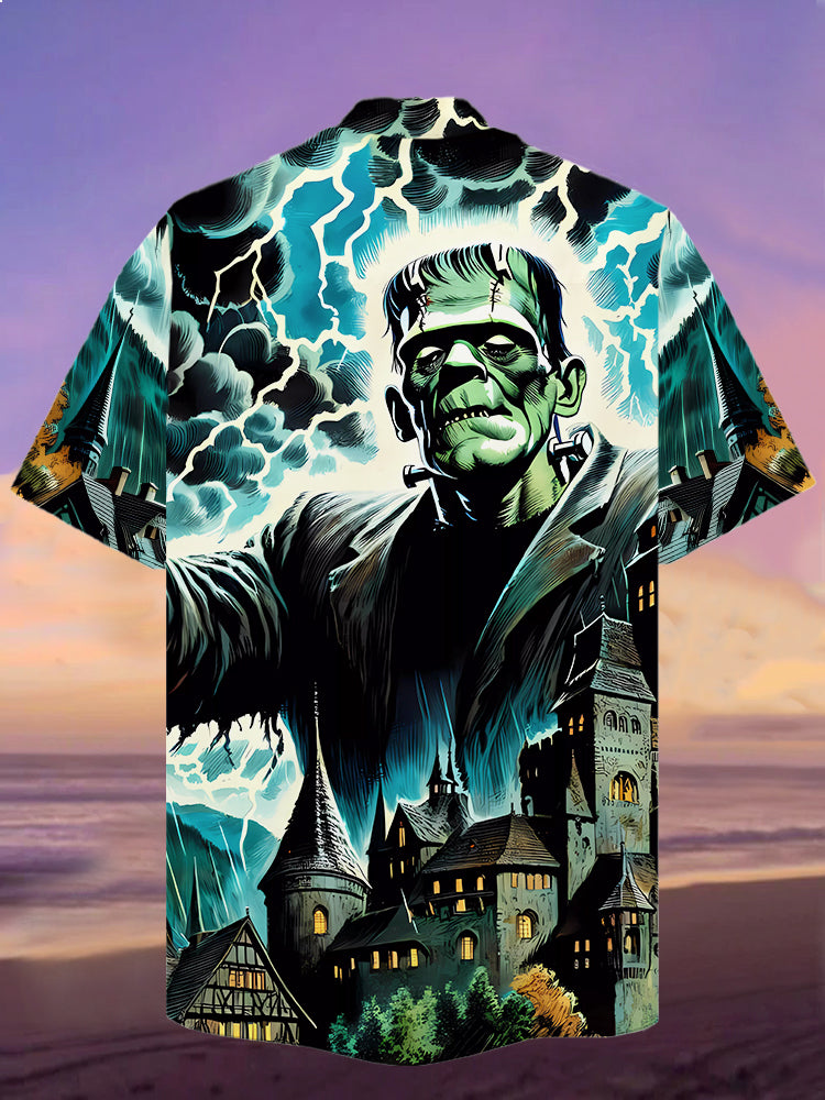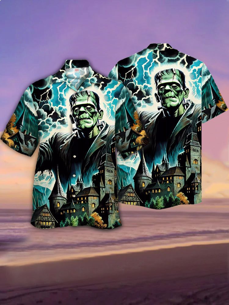 • Eye-Catching Classic Horror Characters And Castles In Lightning Printing Cuban Collar Hawaiian Short Sleeve Shirt