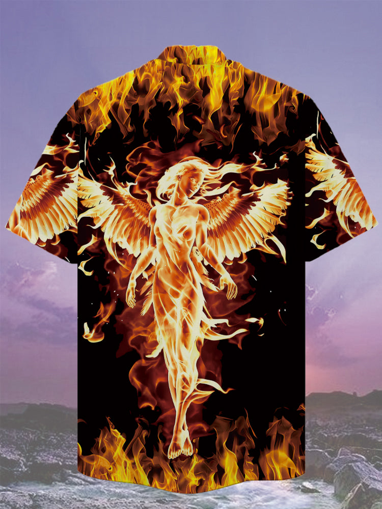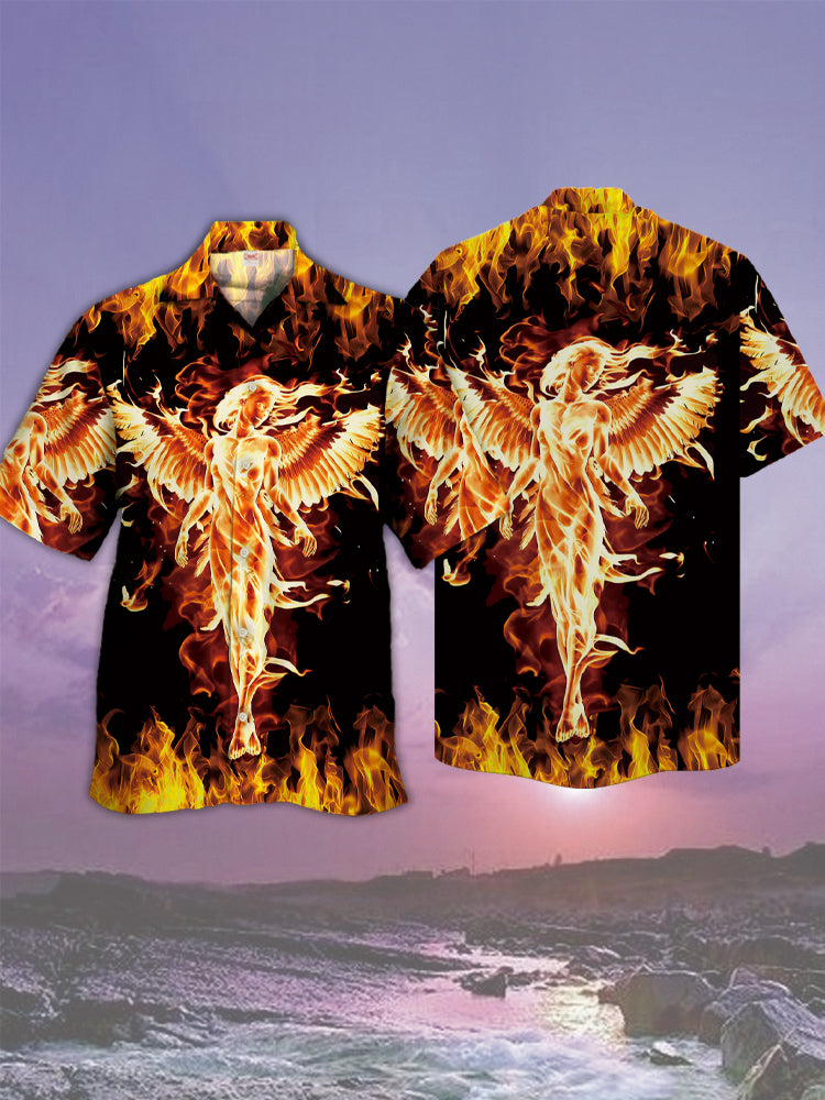 • Eye-Catching Stunning Style Flame Angel Printing Cuban Collar Hawaiian Short Sleeve Shirt