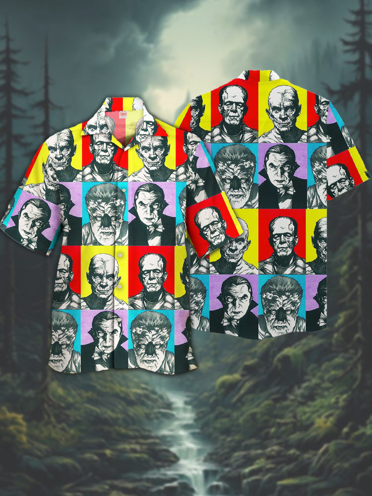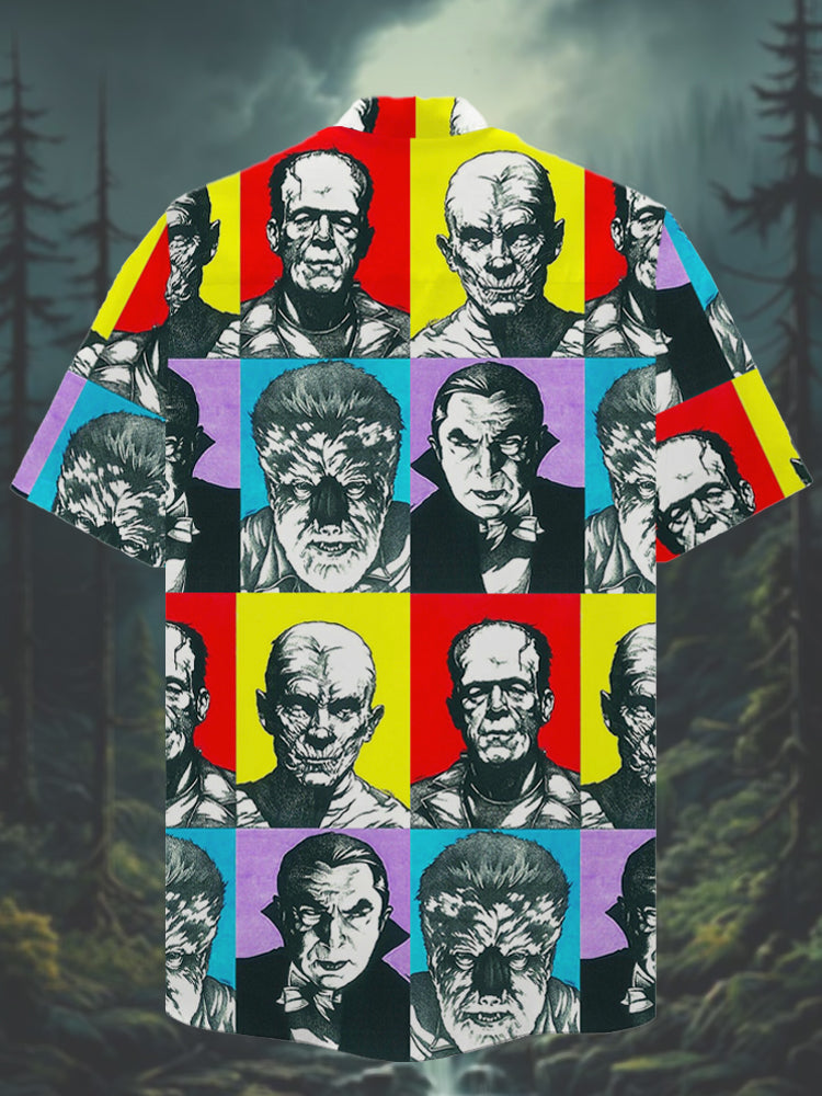 • Eye-Catching Color Block Splicing Horror Characters Printing Cuban Collar Hawaiian Short Sleeve Shirt