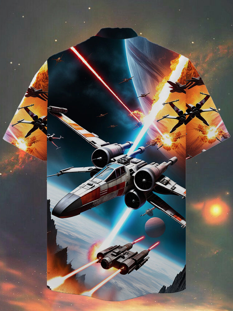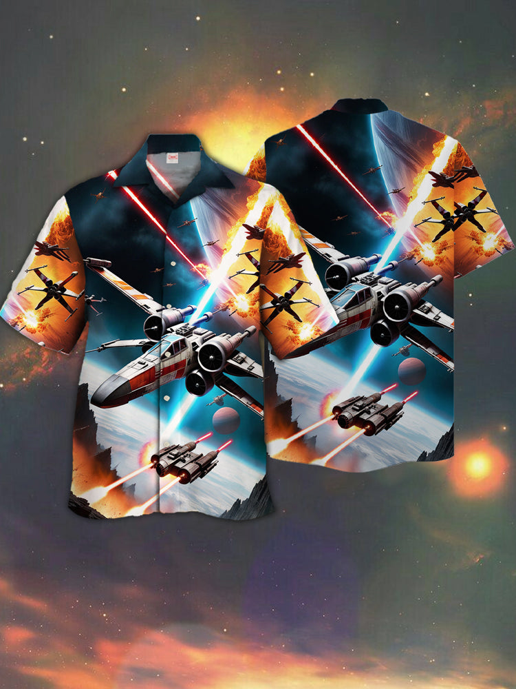 • Eye-Catching Sci-Fi Space Fighter Fleet Battle Printing Cuban Collar Hawaiian Short Sleeve Shirt