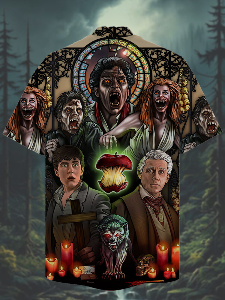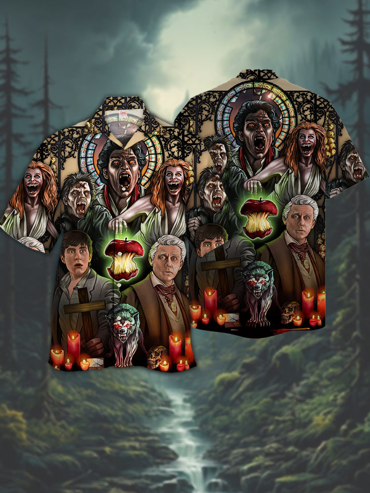 • Eye-Catching Thriller Style Magic Apple And Horror Characters Printing Cuban Collar Hawaiian Short Sleeve Shirt