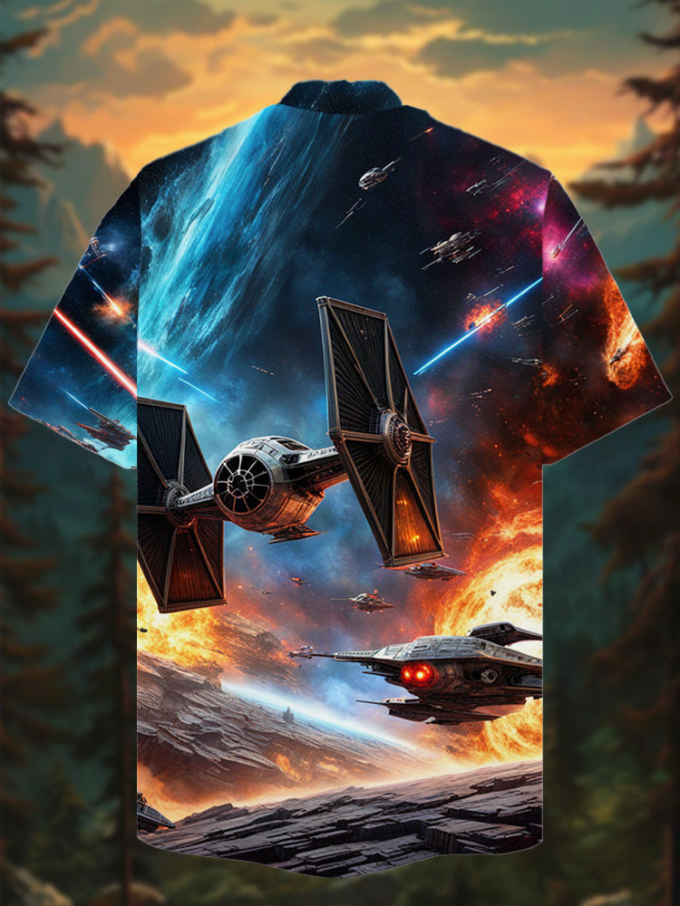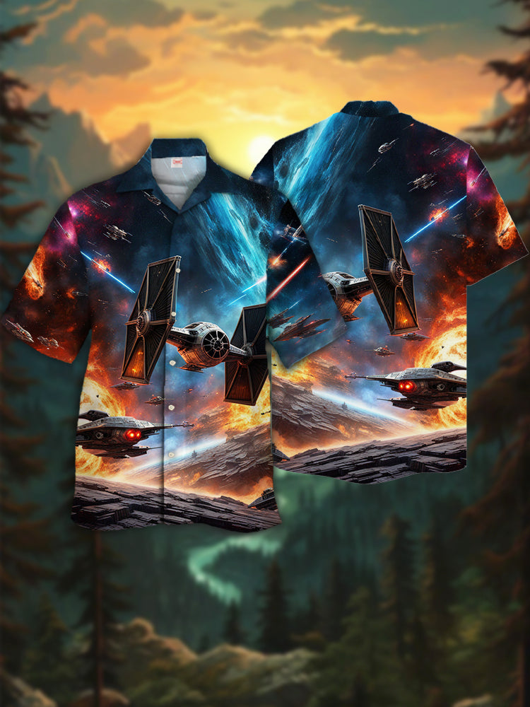 • Eye-Catching Sci-Fi Cool Space War Spaceship Fleet Printing Cuban Collar Hawaiian Short Sleeve Shirt