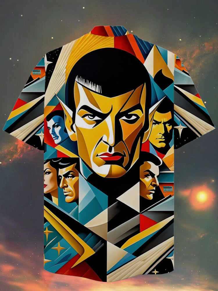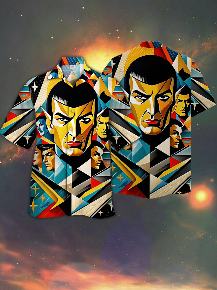 Eye-Catching Retro Contrast Color Geometric Background Character Portraits Printing Cuban Collar Hawaiian Short Sleeve Shirt