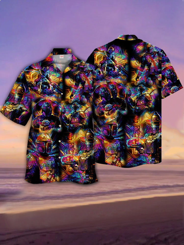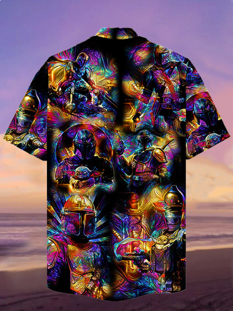 • Eye-Catching Psychedelic Sci-Fi Space Warriors Printing Cuban Collar Hawaiian Short Sleeve Shirt