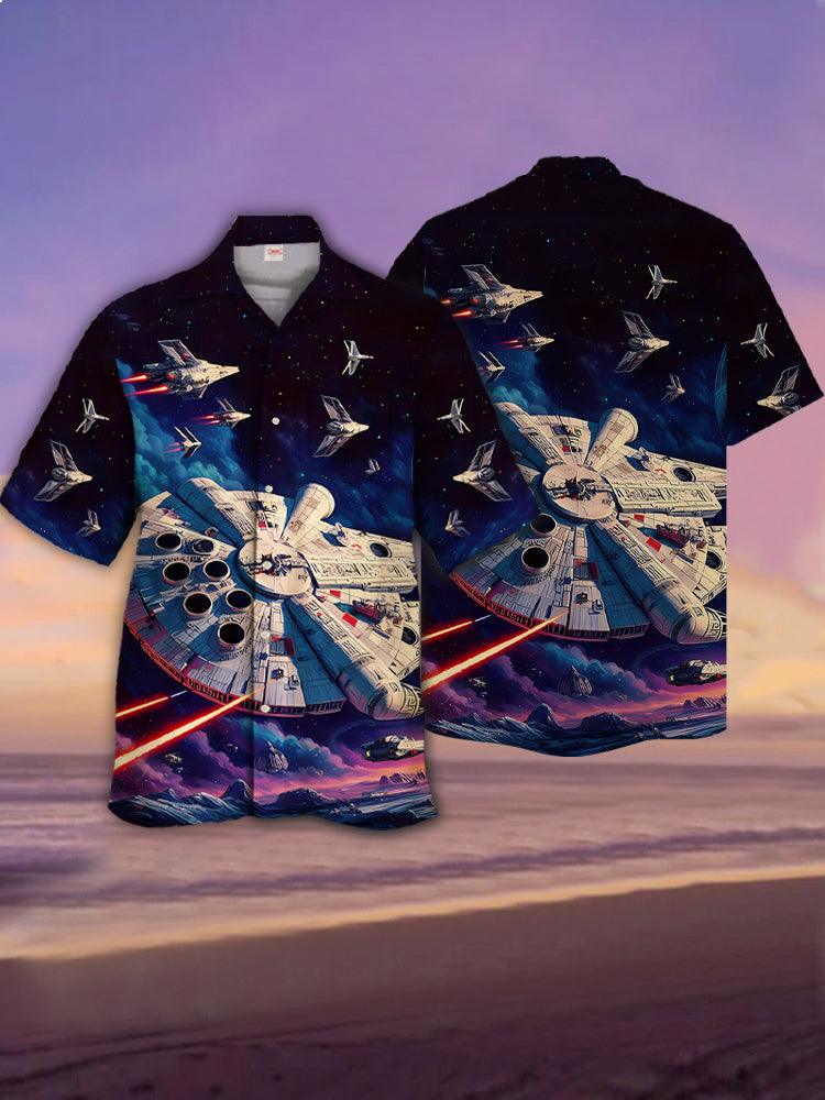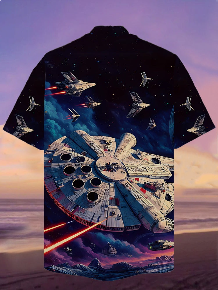 • Eye-Catching Stunning Style Gorgeous Outer Space And Sci-Fi Space Starship Fleet Printing Breast Pocket Cuban Collar Hawaiian Short Sleeve Shirt