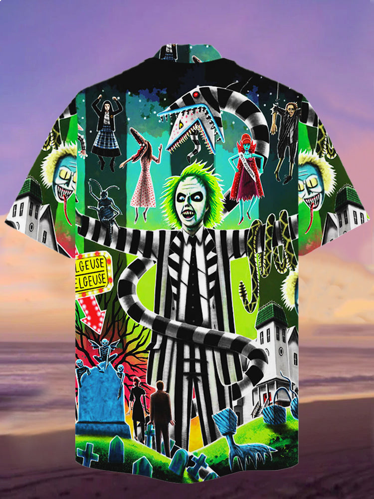 Eye-Catching Psychedelic Cartoon Horror Weirdo Printing Cuban Collar Hawaiian Short Sleeve Shirt