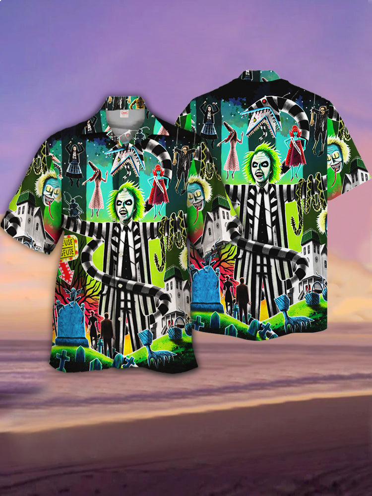 • Eye-Catching Psychedelic Cartoon Horror Weirdo Printing Cuban Collar Hawaiian Short Sleeve Shirt