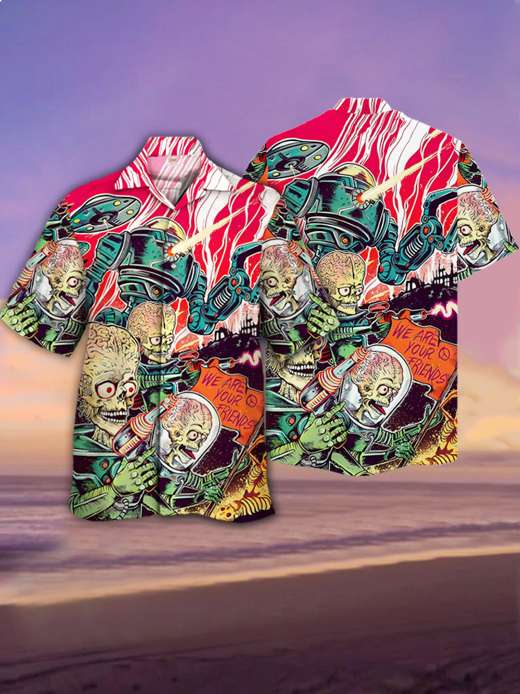 • Eye-Catching Comic Style Alien Invasion Sci-Fi Poster Printing Cuban Collar Hawaiian Short Sleeve Shirt