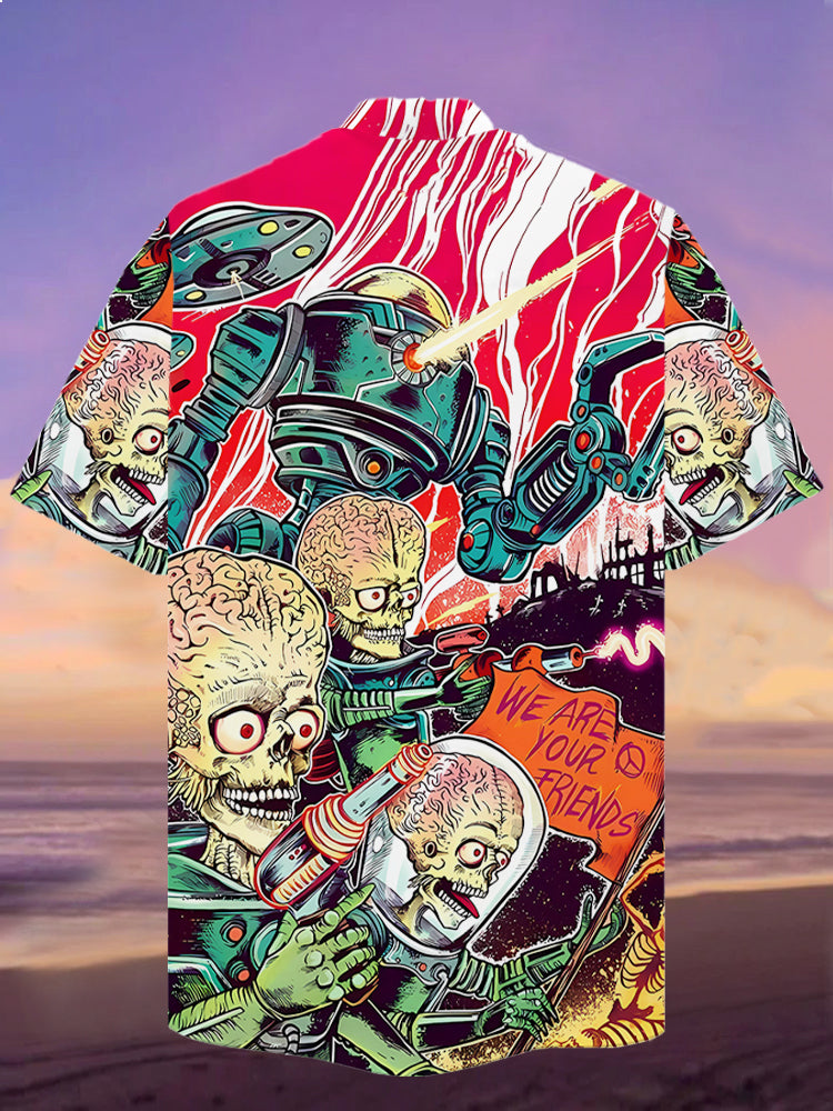 Eye-Catching Comic Style Alien Invasion Sci-Fi Poster Printing Cuban Collar Hawaiian Short Sleeve Shirt