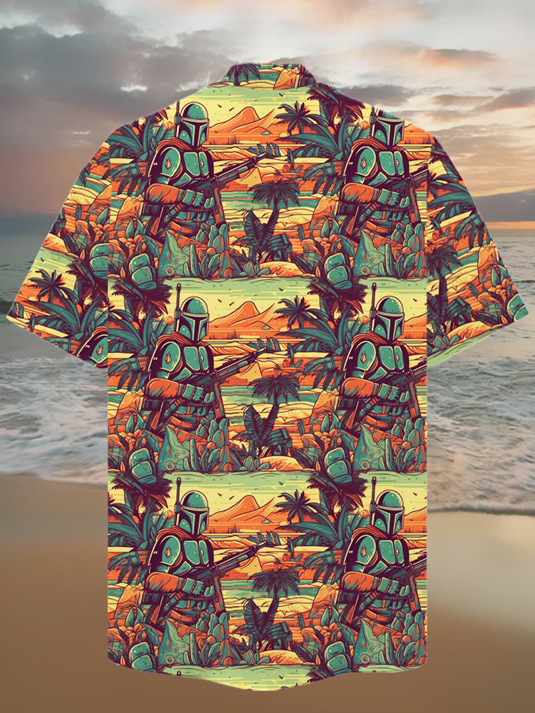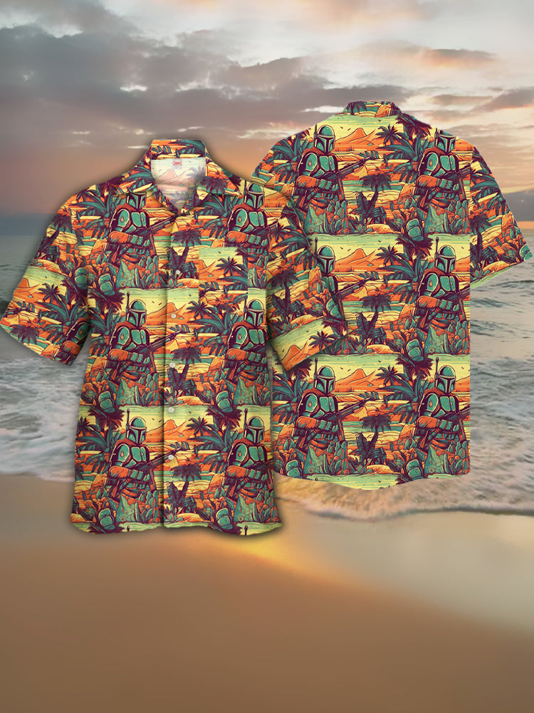 • Eye-Catching Comic Style Sci-Fi Space War Desert And Samurai Printing Cuban Collar Hawaiian Short Sleeve Shirt