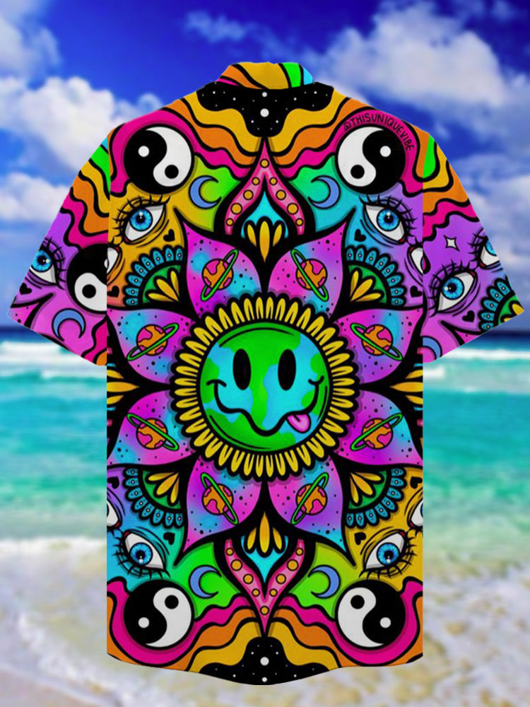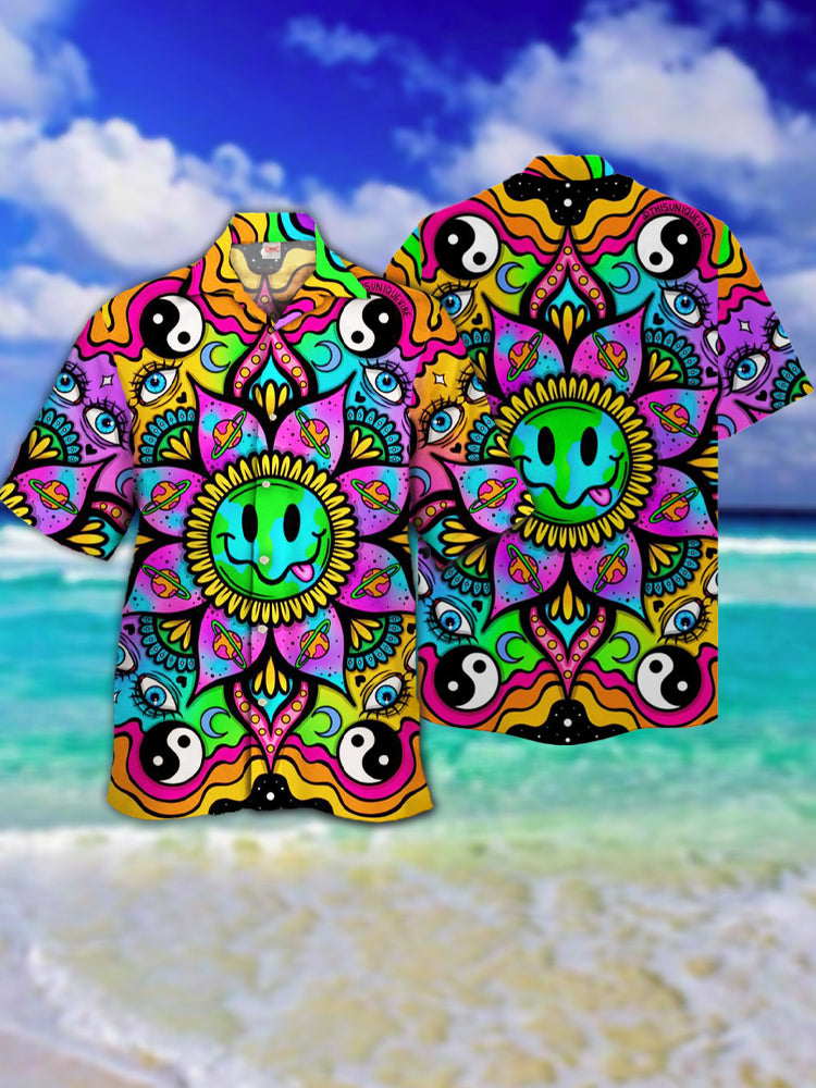 Eye-Catching Neon Hippie Psychedelic Smiley Face Flower Printing Cuban Collar Hawaiian Short Sleeve Shirt