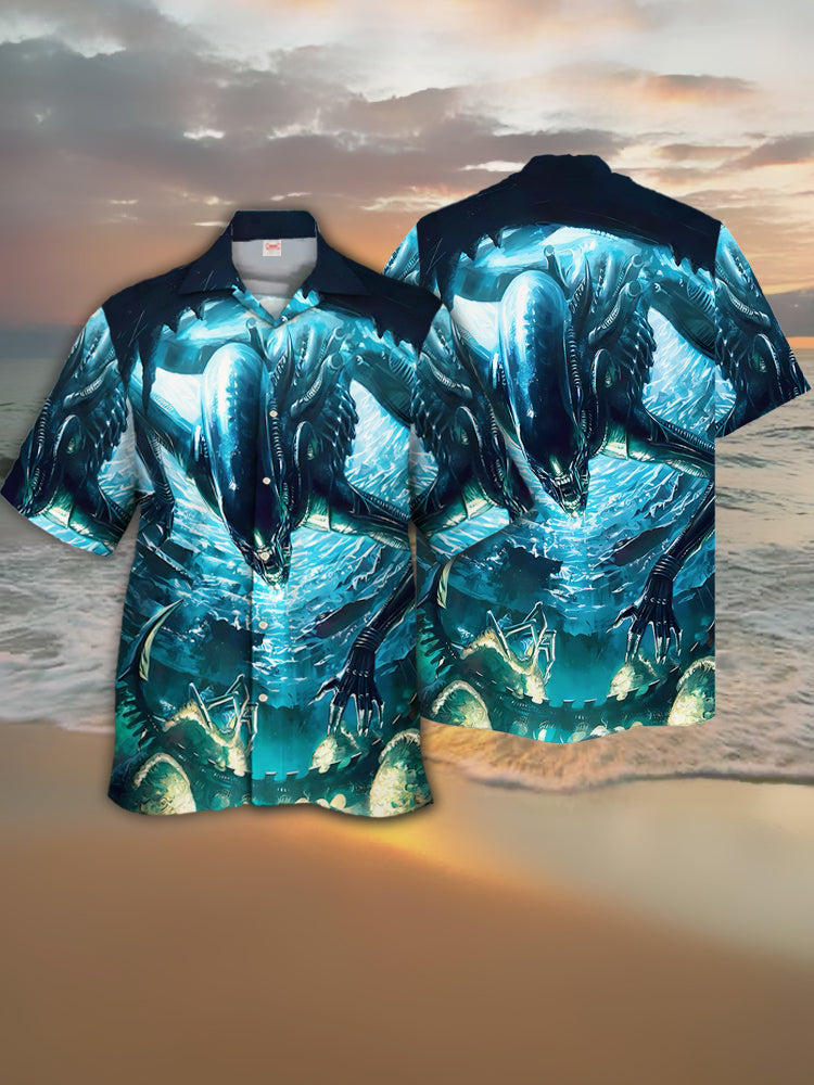 • Eye-Catching Blue Cave Sci-Fi Alien World Alien Creature Printing Cuban Collar Hawaiian Short Sleeve Shirt