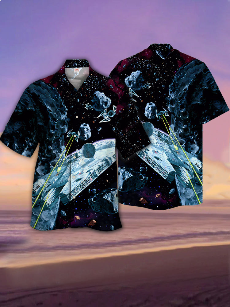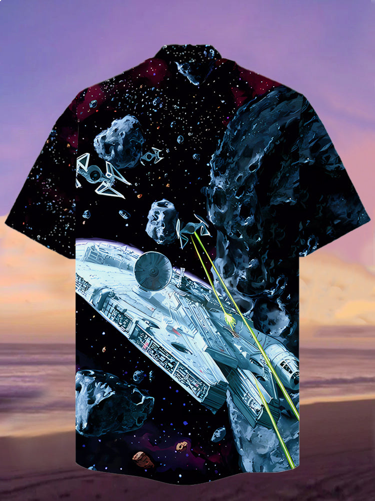 • Eye-Catching Psychedelic Sci-Fi Black Space Galaxy And Spaceship Printing Cuban Collar Hawaiian Short Sleeve Shirt