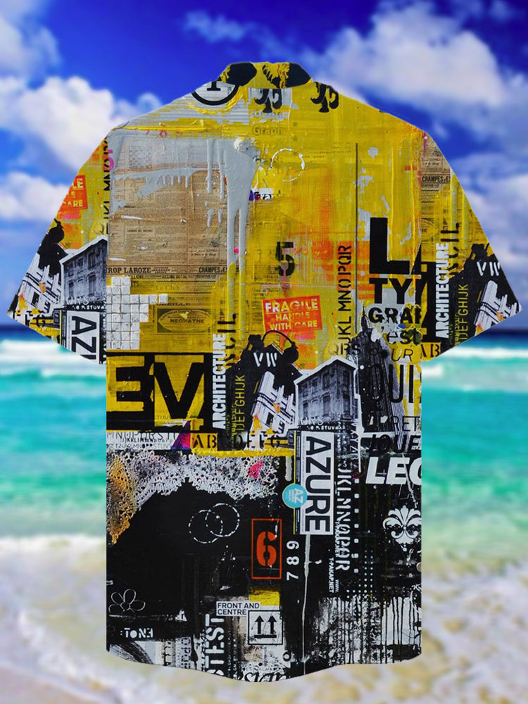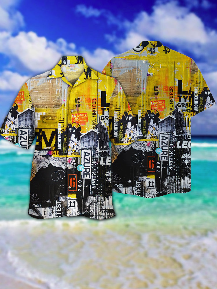 • Eye-Catching Graffiti Pattern Pop Art Orange And Black Retro Architecture Silhouette Printing Cuban Collar Hawaiian Short Sleeve Shirt