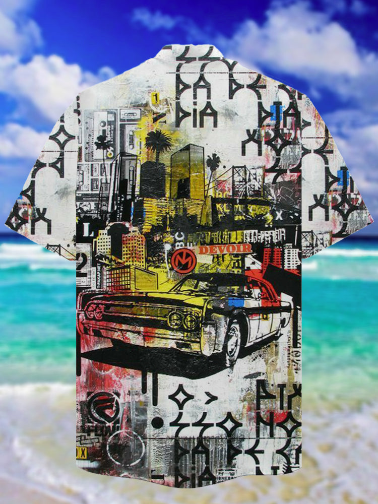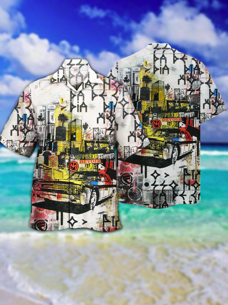 • Eye-Catching Abstract Pop Art Urban Graffiti Retro Car Silhouette Printing Cuban Collar Hawaiian Short Sleeve Shirt