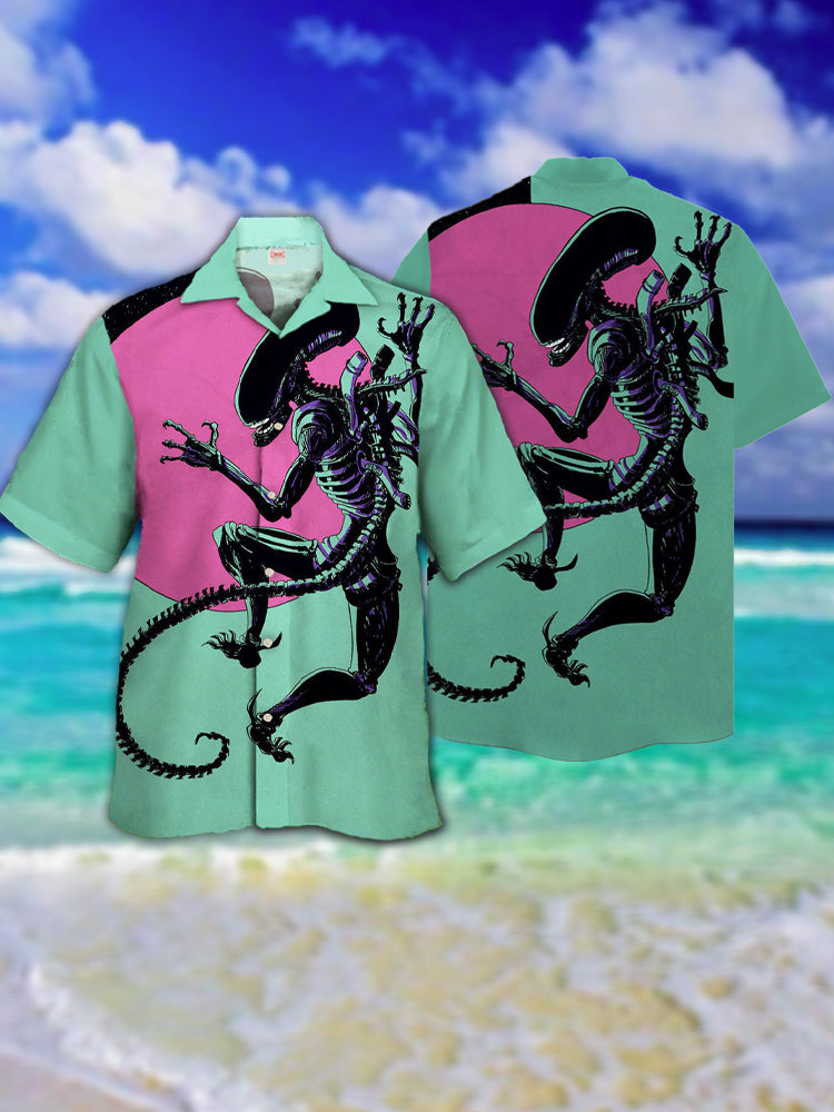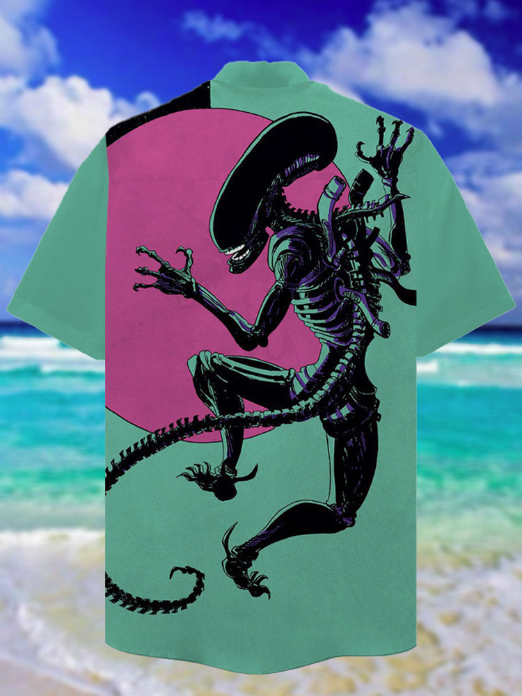 • Eye-Catching Abstract Color Contrast Art Sci-Fi Alien World Alien Creature Printing Cuban Collar Hawaiian Short Sleeve Shirt