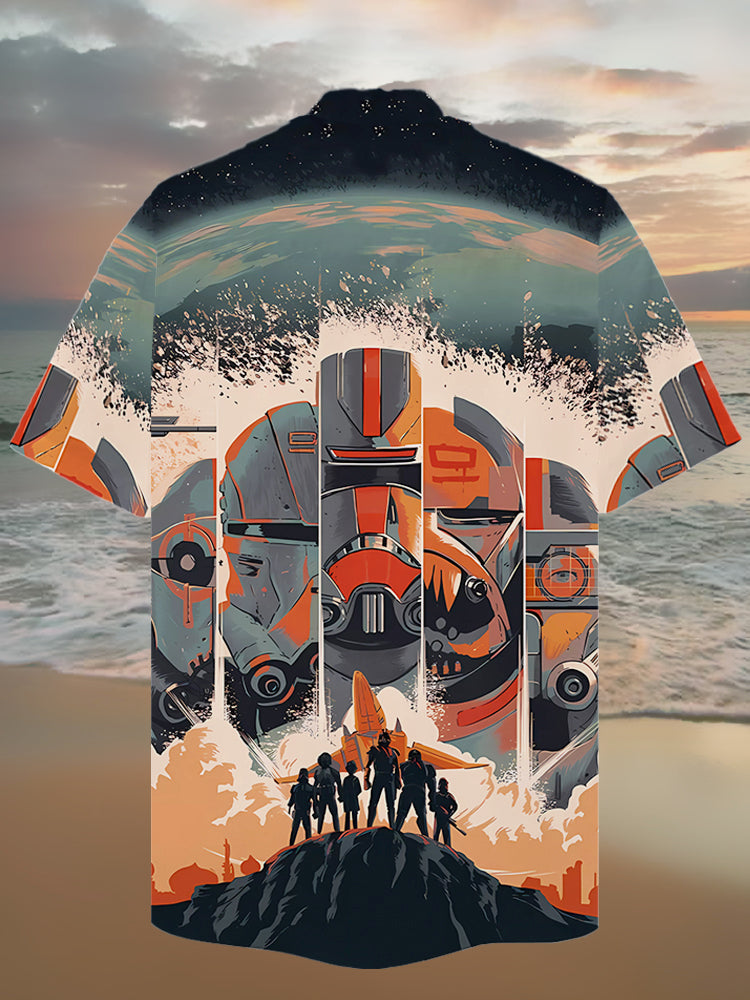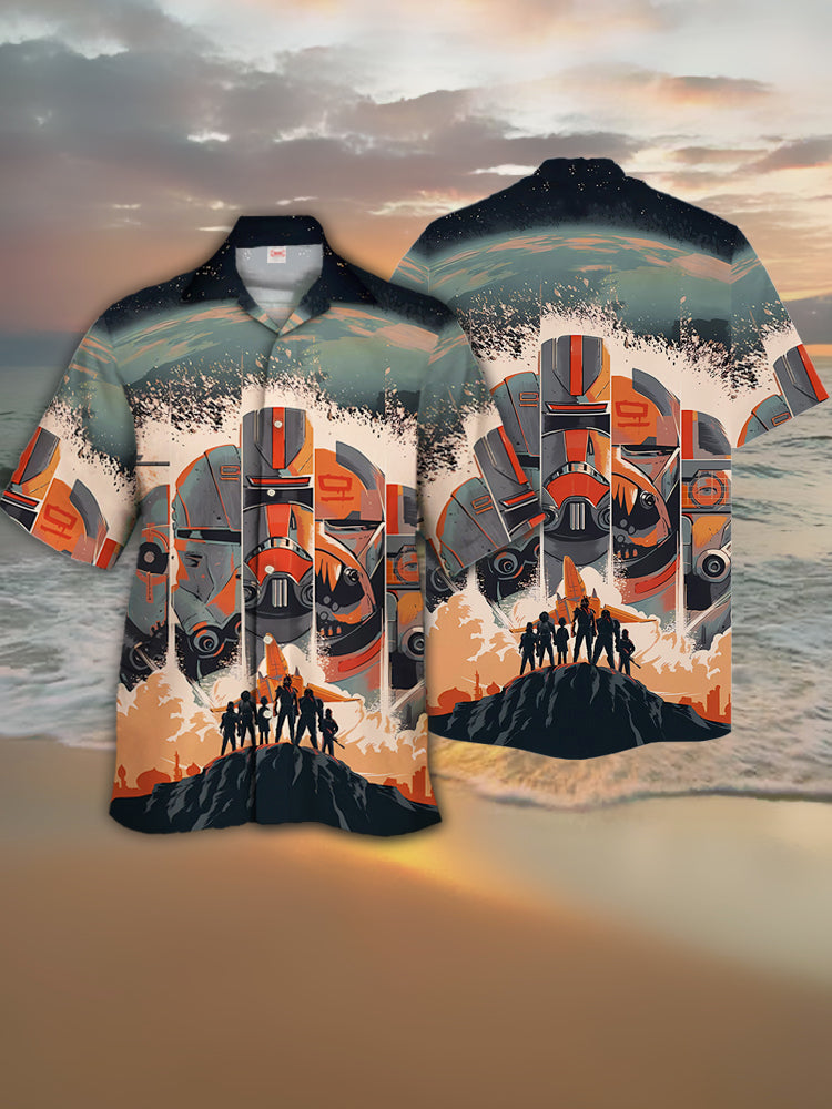• Eye-Catching Space Wars Samurais Poster Printing Cuban Collar Hawaiian Short Sleeve Shirt