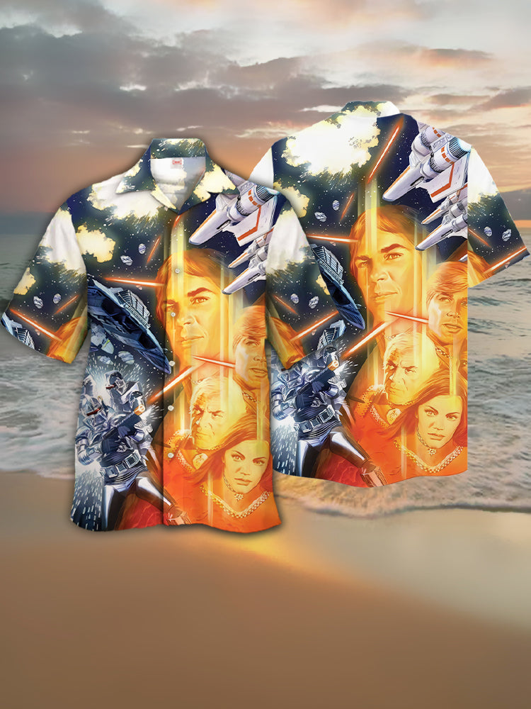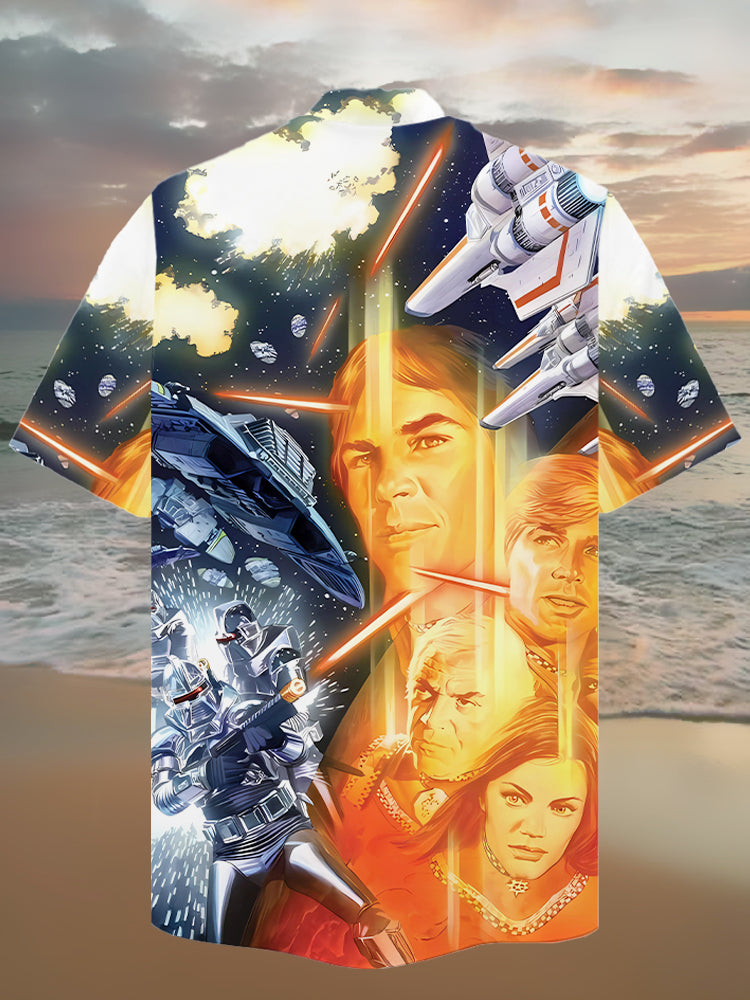 • Eye-Catching Classic Shocking Sci-Fi Space War Printing Cuban Collar Hawaiian Short Sleeve Shirt