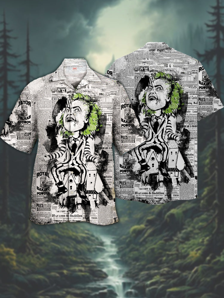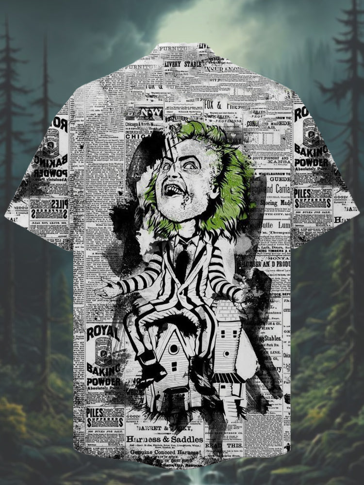 • Eye-Catching Vintage Classic Horror Character And Newspaper Background Printing Cuban Collar Hawaiian Short Sleeve Shirt