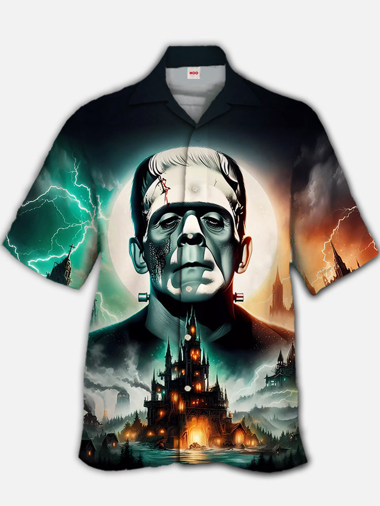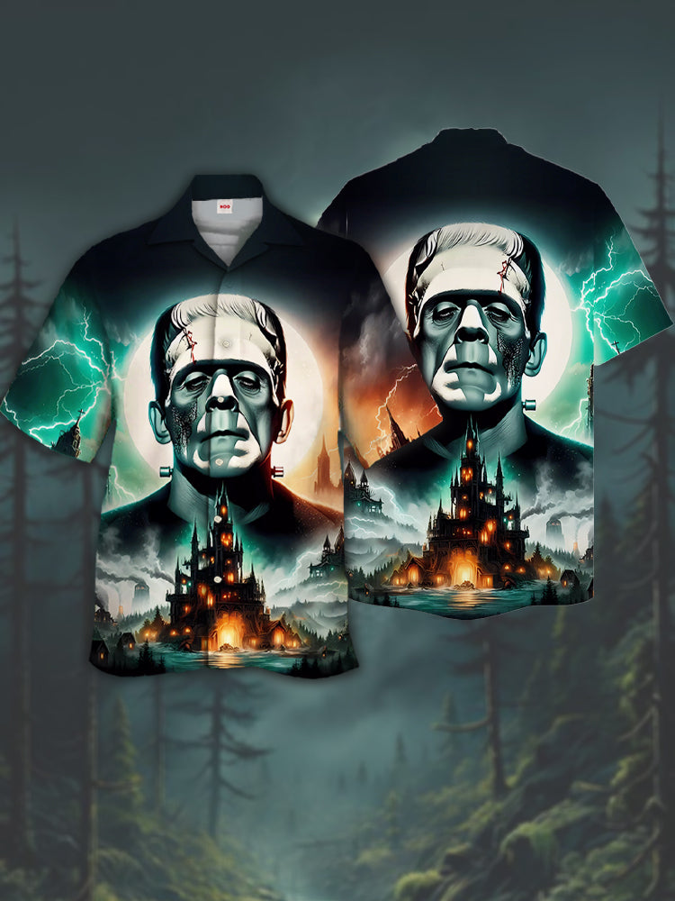 • Eye-Catching Classic Horror Art Horror Characters and Ghost Castle Printing Cuban Collar Hawaiian Short Sleeve Shirt