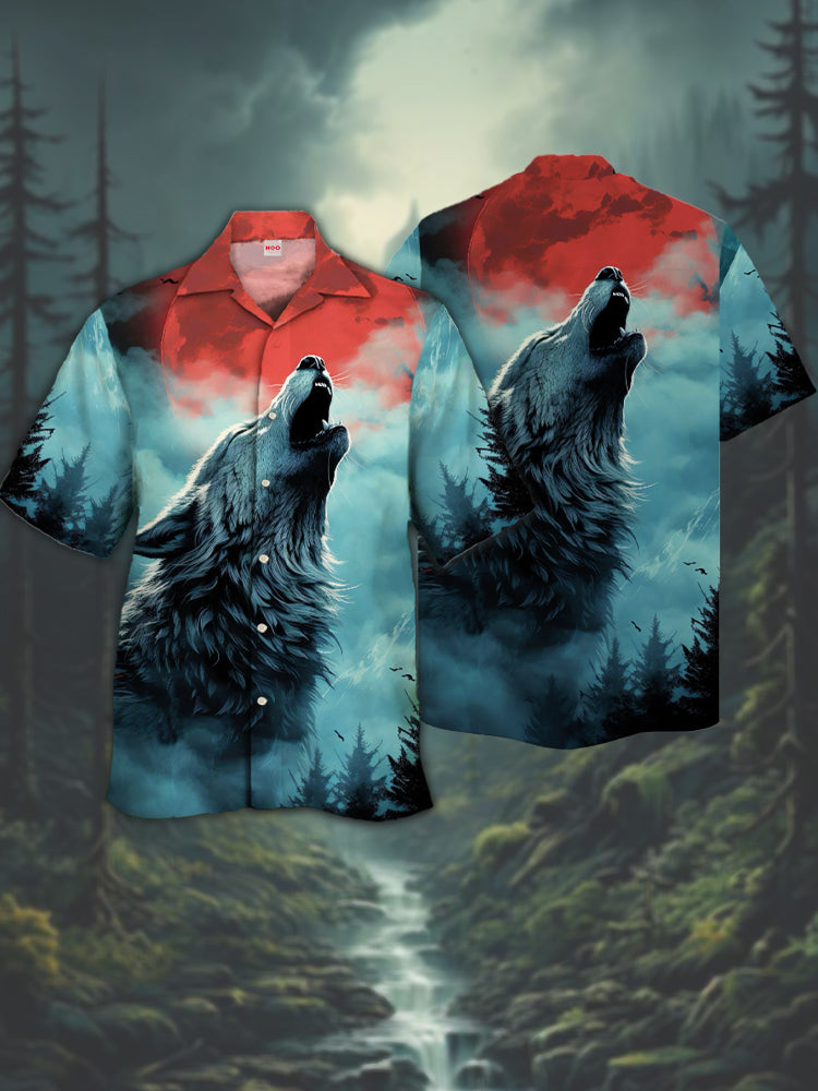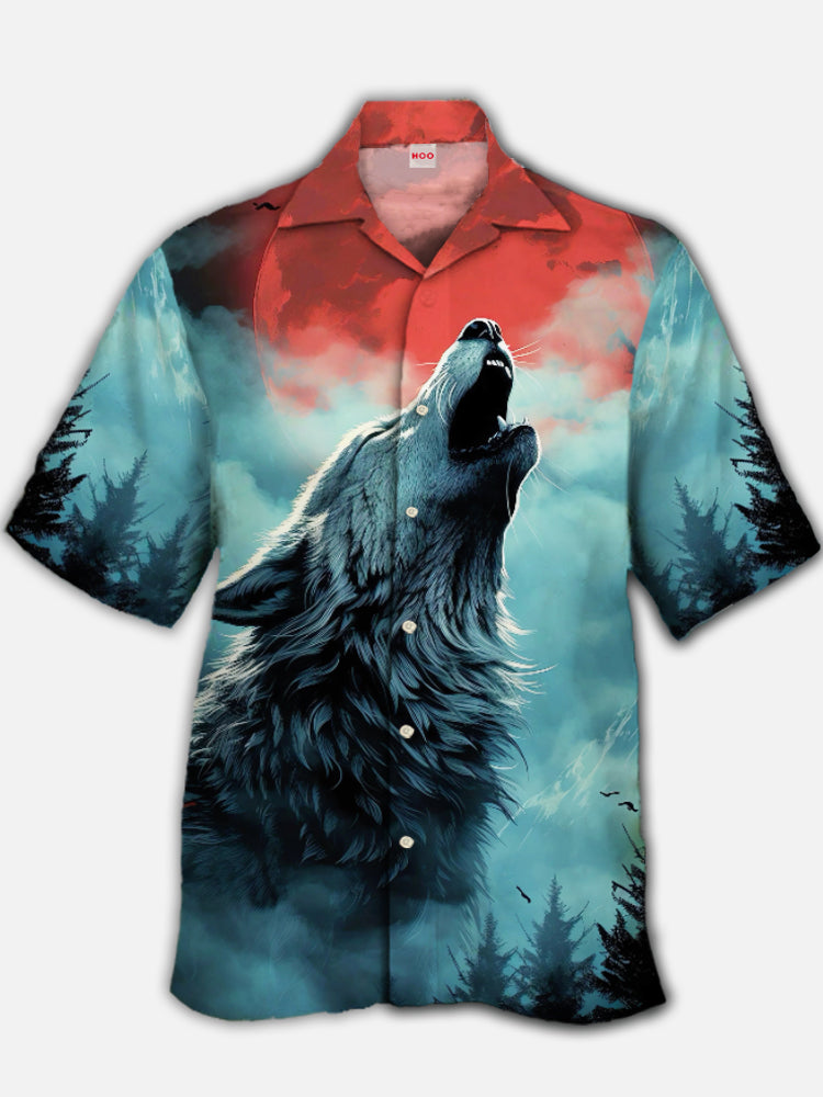 • Eye-Catching Stunning Style Blood Moon And Howling Wolf Printing Cuban Collar Hawaiian Short Sleeve Shirt