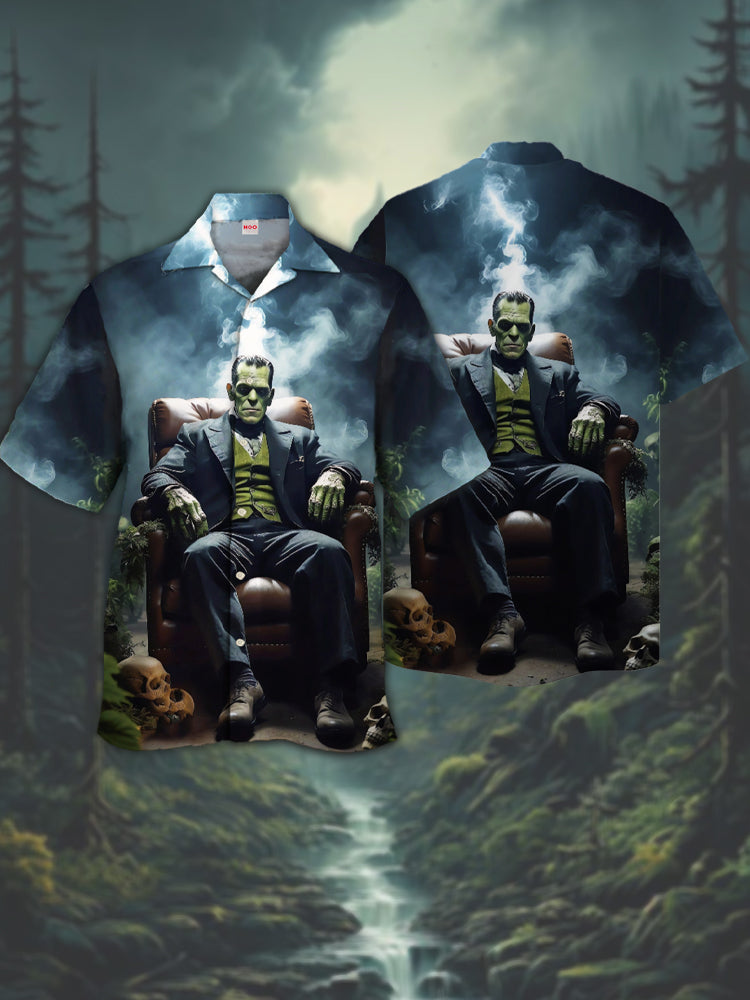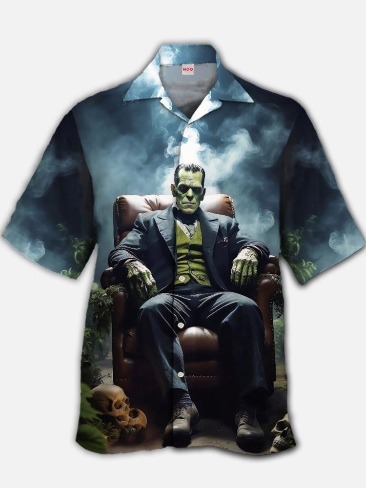 • Eye-Catching Thriller Style Classic Horror Character Sitting On Leather Sofa Printing Cuban Collar Hawaiian Short Sleeve Shirt