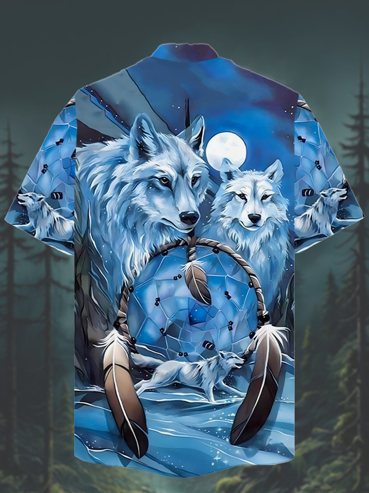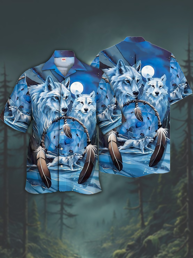 • Eye-Catching Blue Icefield White Wolves Printing Cuban Collar Hawaiian Short Sleeve Shirt