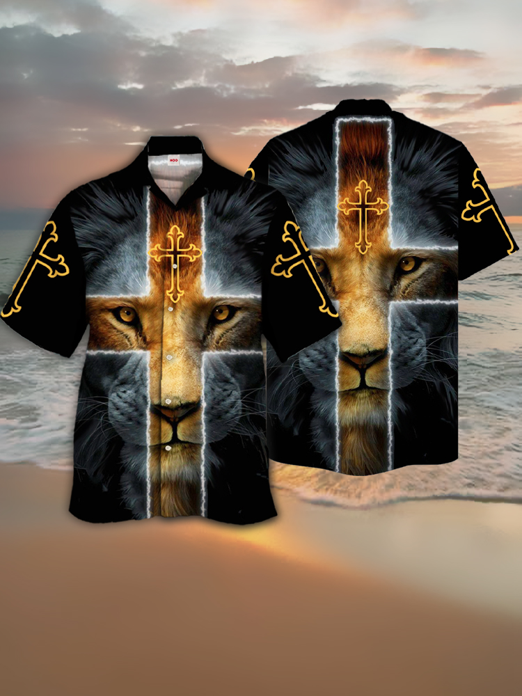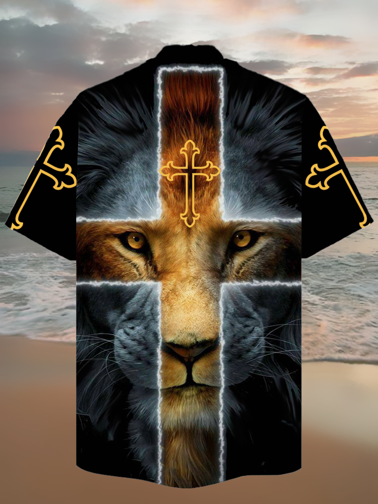 • Eye-Catching Black Gold Lion Face And Cross Printing Cuban Collar Hawaiian Short Sleeve Shirt