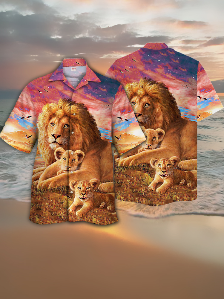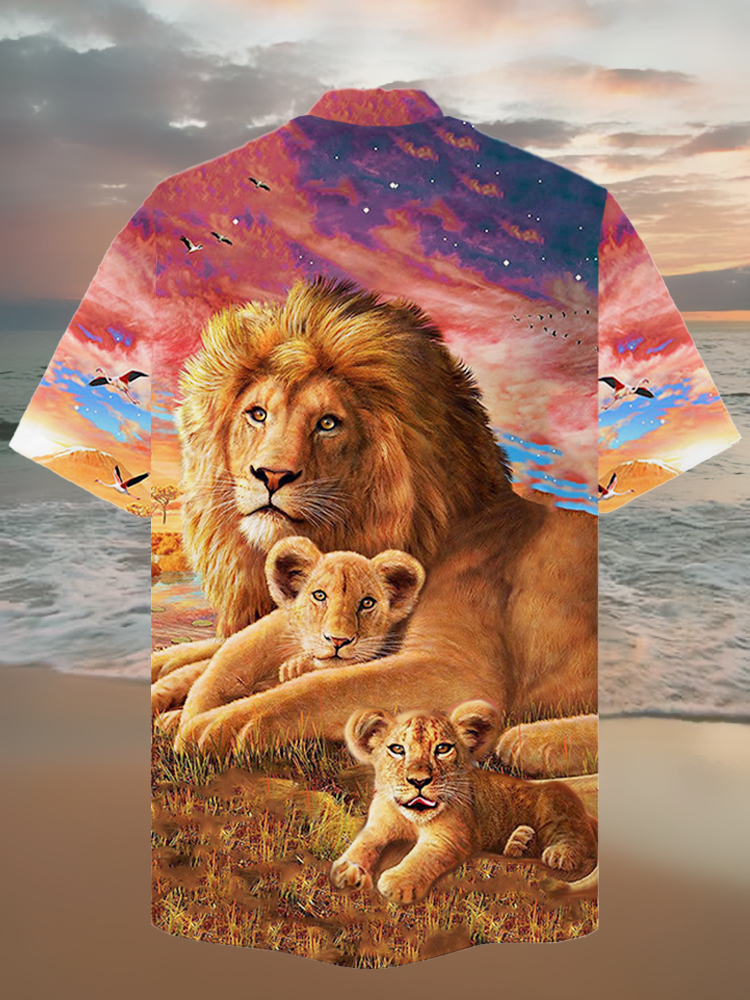 • Eye-Catching Powerful Lion Father And Sons Printing Cuban Collar Hawaiian Short Sleeve Shirt
