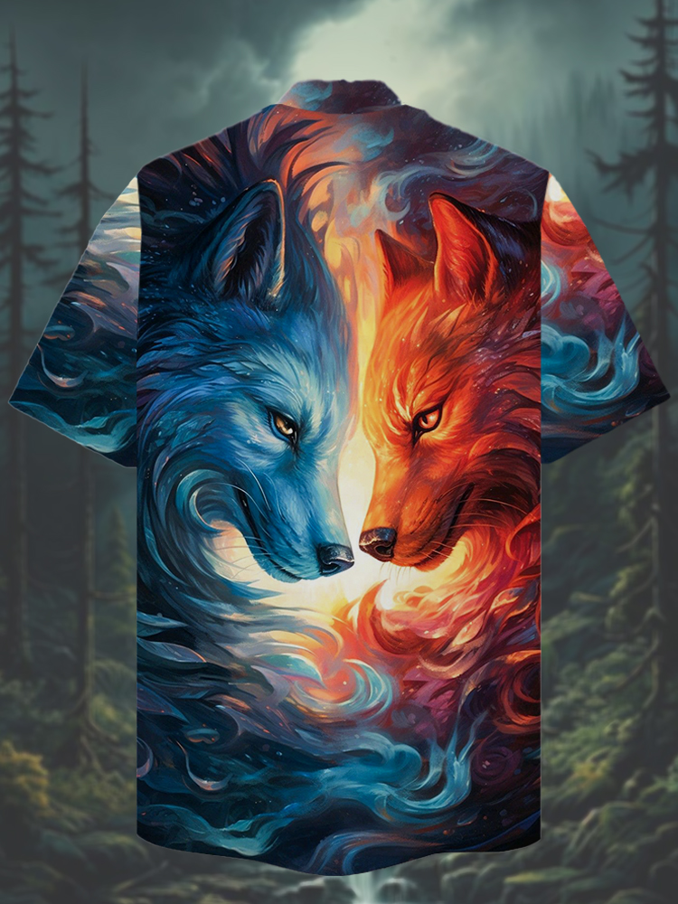 Eye-Catching Colorful Cool Ice Wolf And Fire Wolf Printing Cuban Collar Hawaiian Short Sleeve Shirt