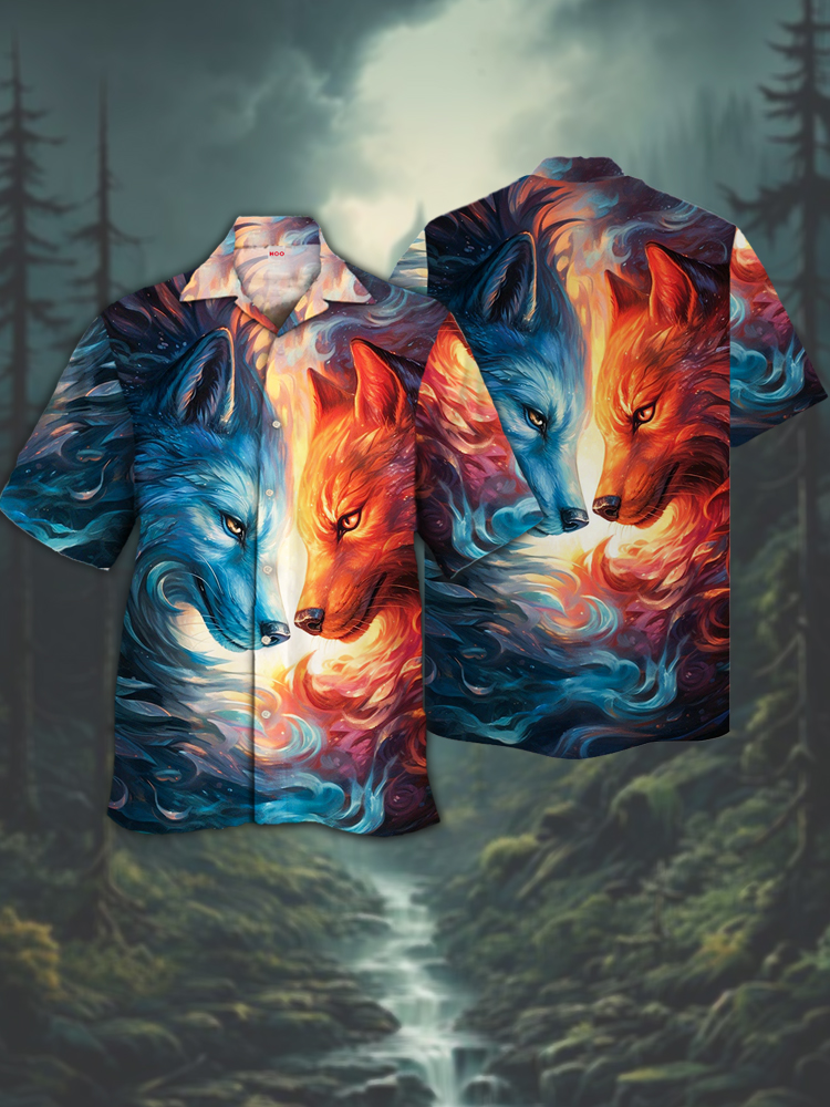 • Eye-Catching Colorful Cool Ice Wolf And Fire Wolf Printing Cuban Collar Hawaiian Short Sleeve Shirt