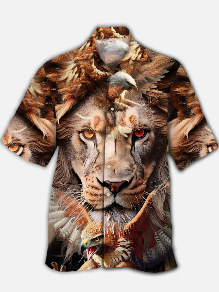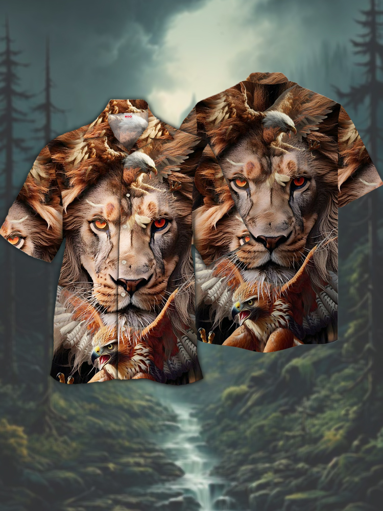 • Eye-Catching Fierce Carnivores Lions And Eagles Printing Cuban Collar Hawaiian Short Sleeve Shirt