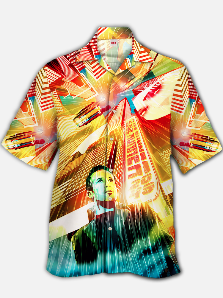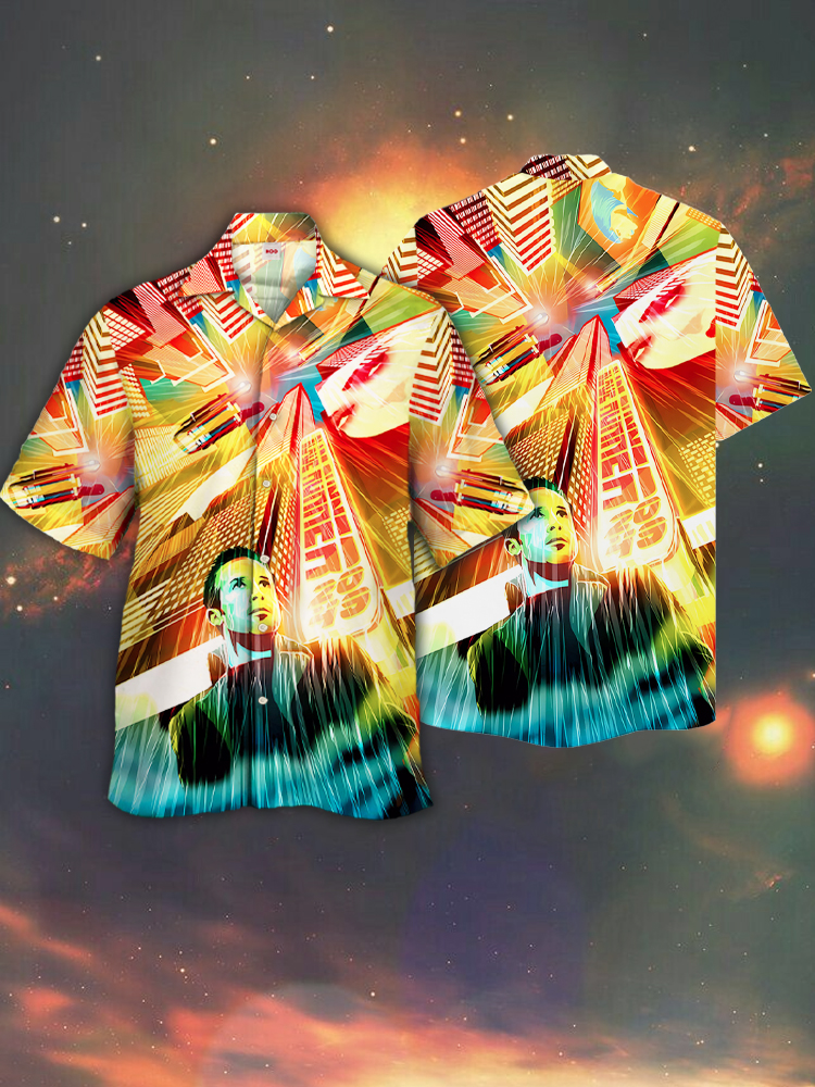 • Eye-Catching Abstract City Neon Poster And Character Portrait Printing Cuban Collar Hawaiian Short Sleeve Shirt