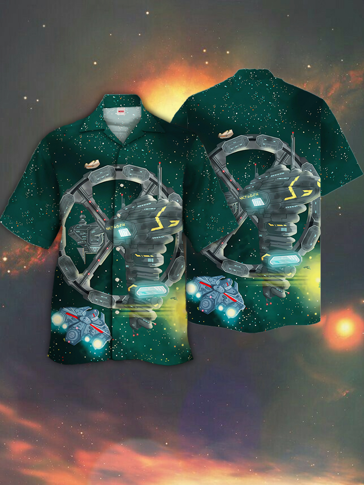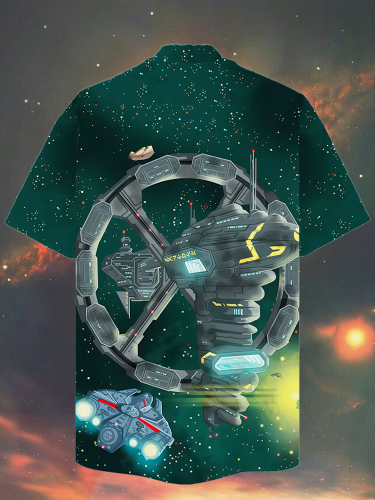 • Eye-Catching Green Outer Space Sci-Fi Space Station And Spaceship Printing Cuban Collar Hawaiian Short Sleeve Shirt
