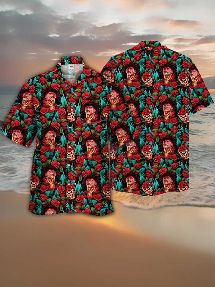 • Eye-Catching Stunning Style Roses And Classic Horror Characters Printing Cuban Collar Hawaiian Short Sleeve Shirt