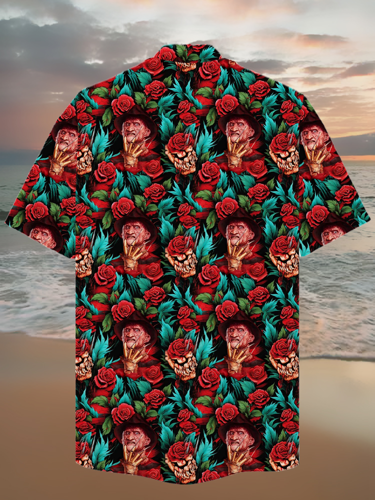 Eye-Catching Stunning Style Roses And Classic Horror Characters Printing Cuban Collar Hawaiian Short Sleeve Shirt