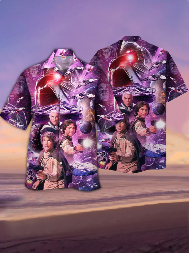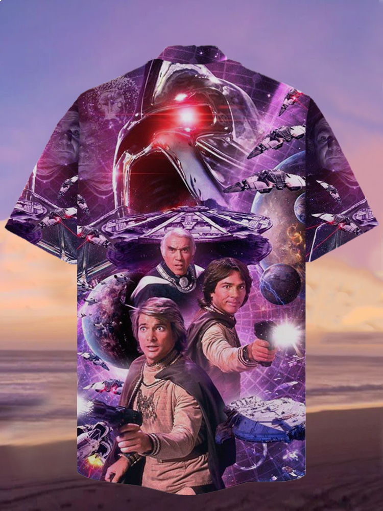 • Eye-Catching Sci-Fi Space War Purple Gorgeous Space And Characters Printing Cuban Collar Hawaiian Short Sleeve Shirt