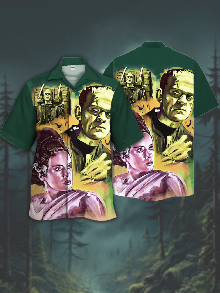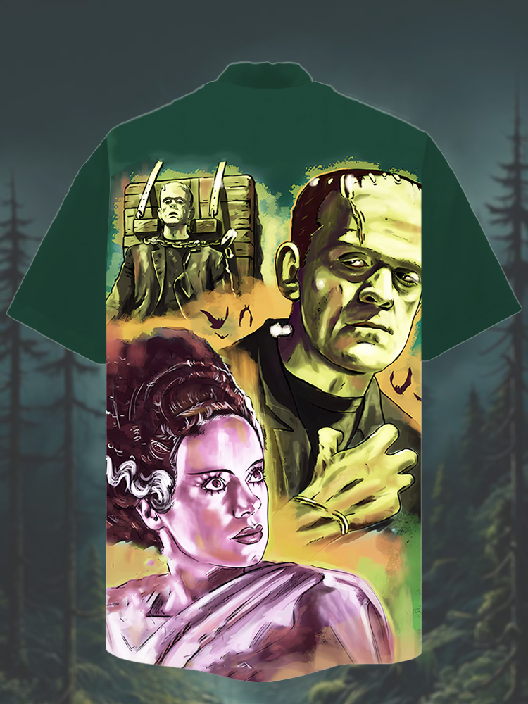 • Eye-Catching Green Comic Style Horror Movie Characters Printing Cuban Collar Hawaiian Short Sleeve Shirt