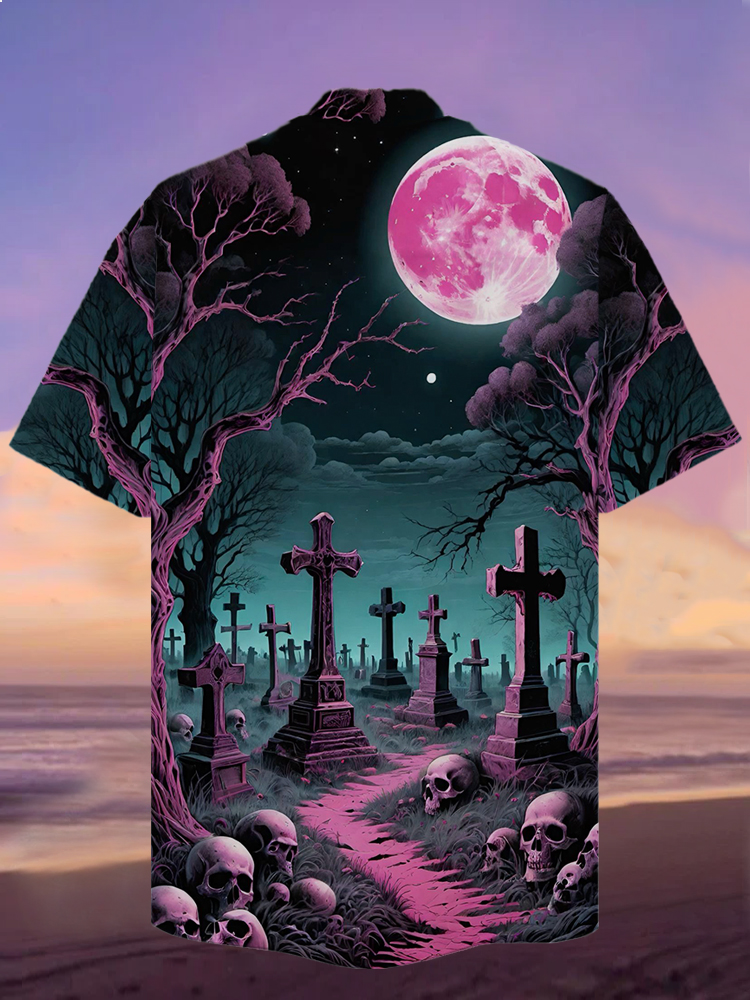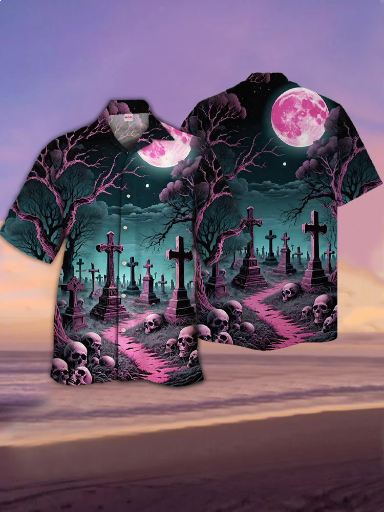 • Eye-Catching Horror Night Silent Cemetery Printing Cuban Collar Hawaiian Short Sleeve Shirt